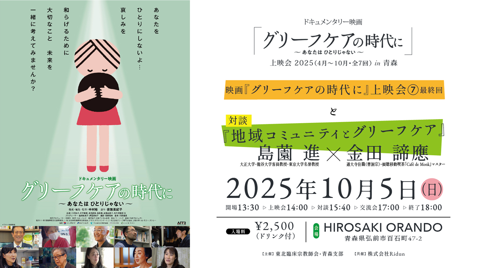 【告知】2025年10月5日・ドキュメンタリー映画『グリーフケアの時代に』上映会(7)と、 島薗 進先生・金田 諦應先生 対談 『地域コミュニティとグリーフケア』申し込み受付開始しました。